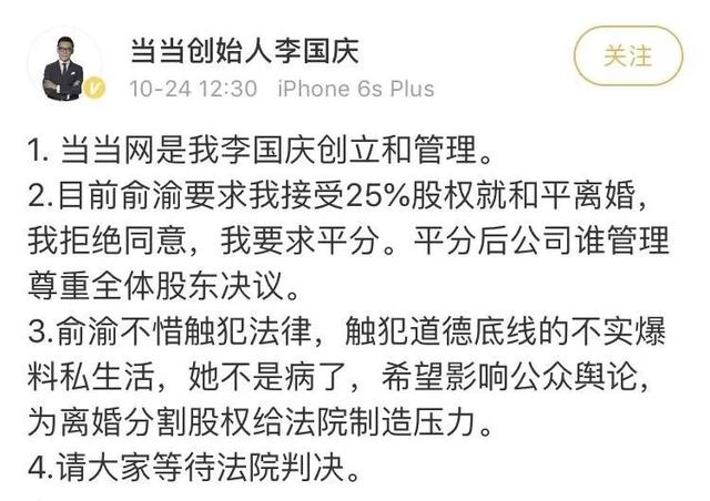 如今,俞渝持股当当64.2%,李国庆持股比例27.51%,合计持股比例逾90%。李国庆曾在其微博上表示,拒绝接受25%的股权离婚,而是要求平分。若李国庆最终分割到约45%股份,当当又将面临新一轮的股权变动。