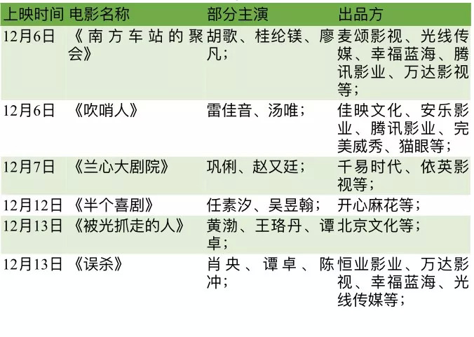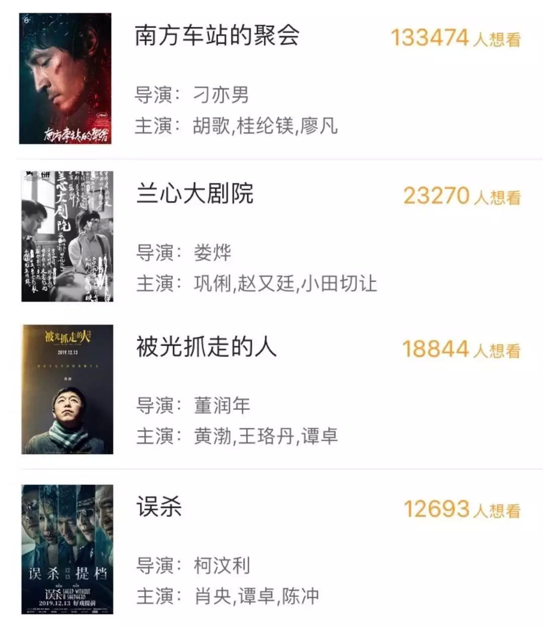 国产片的第二梯队则是12月上半旬上映的《南方车站的聚会》(以下简称《南方车站》)《吹哨人》《兰心大剧院》《背光抓走的人》《误杀》等影片。不难看出,12月打头阵的这批国产电影,并不是爆米花类型的商业大片,而是中小成本的口碑文艺类型片。有网友称这是一个“文艺贺岁档”。