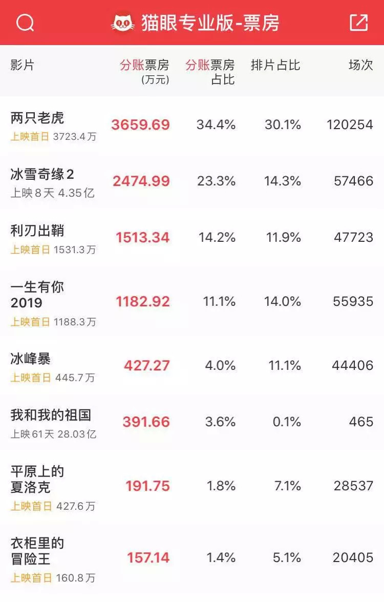 目前可以按照时间将国产电影分为几个梯队,第一梯队就是今日上映的《两只老虎》《冰峰暴》等电影。从排片到票房走势,《两只老虎》是其中的种子选手。