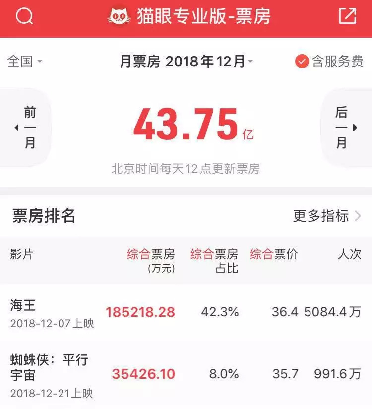 12月下半旬则出现了索尼的口碑动画电影《蜘蛛侠:平行宇宙》(以下简称《平行宇宙》),趁着11月《毒液》在国内掀起的现象级热潮,索尼超英宇宙在国内粉丝中的认知度与喜爱度空前高涨,《平行宇宙》依托蜘蛛侠IP和优质的动画设计、宇宙平行概念,获得口碑认可。