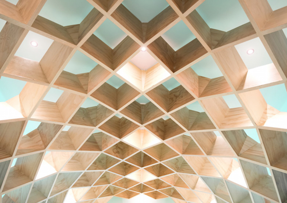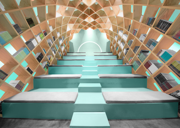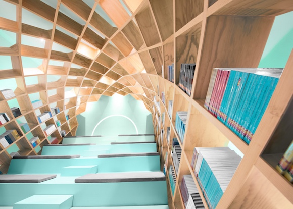 在墨西哥的首都墨西哥城有一间清新的图书馆:薄荷绿的墙面和楼梯、抛光后的水泥地面、一直延伸到空间顶端的穹顶式木制书架、安在阶梯上的沙发垫......让人觉得安静却不压抑,而且在书架顶端安着的射灯的照射下,还能有一种向往求知的感觉。