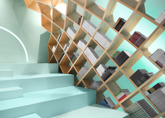 木制书架是整个图书馆的核心,它以薄荷色阶梯为中轴,从左右两边的底层向中心处的上方延伸,“无缝”交汇于空间的顶部。书籍则分门别类地斜靠在两侧的书架格子里,读者只有一直向上走才能知道自己想看的书到底在哪里。“等到你找到你想看的那本书,你就能就近坐在阶梯上的沙发垫上开始轻松地享受阅读的乐趣了。”Trevino说。他之所以选择薄荷色为图书馆的主色调,也正是希望通过视觉上的轻松感引申出读者对于书籍和阅读的享受。