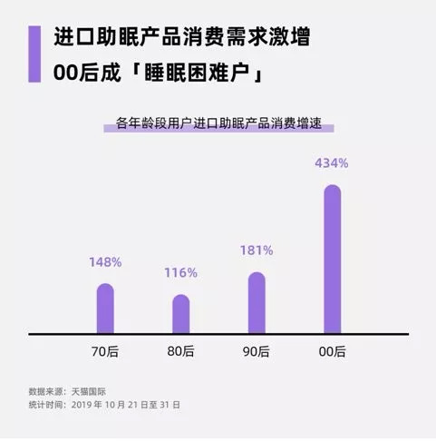 据电商平台数据显示,2019年1-8月,90后购买进口助眠类商品的增幅为118%,人数占总消费人数比例的62%,超过了其他年龄群体的总和。另外据央视财经报道,双十一购买进口助眠产品的人数中,00后同比增长了434%。