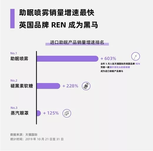 在刚刚过去的双十一购物节中,天猫国际购预售期间买进口助眠类商品的人数同比增长174%,其中,00后增长达434%。年中大促618期间天猫国际进口助眠类商品成交同比增长530%,整体市场规模超3亿元。