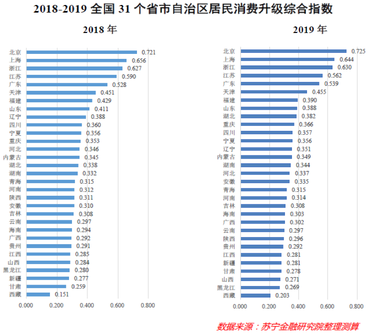 从2019年全国各省市自治区居民消费升级综合水平来看,北京、上海、浙江、江苏、广东为第一梯队;广西、云南、陕西、贵州、江西、新疆、甘肃、山西、黑龙江、西藏位于第三梯队,其他省市区处于第二梯队。除了西藏的指数数值大幅度落后之外,其他每个梯队中各省份区分度并不十分显著。