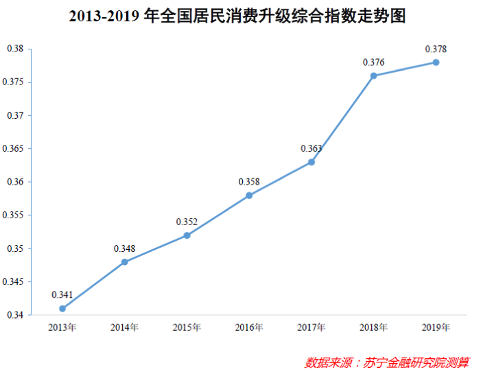报告显示,2019年全国居民消费升级综合指数为0.378,较上年微增0.5%,为2013年苏宁金融研究院有统计以来上升幅度首次不到1%。