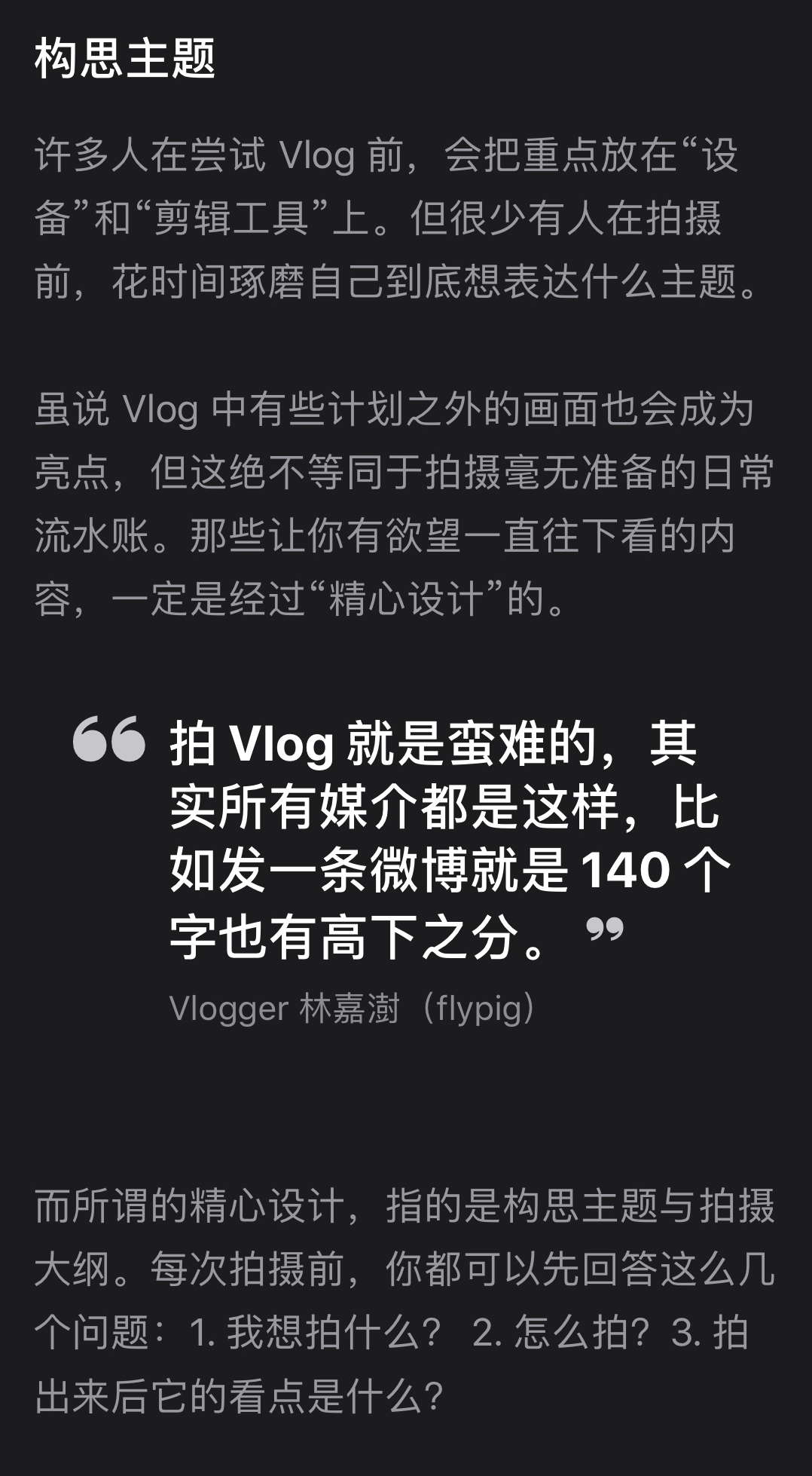 这么讲起来,其实想要拍好Vlog也是很难的,因为大到电影不也是讲好故事的艺术吗?许多经典电影依托的就是一个个优秀的故事,其实视频、文字、音乐都是这样,所以nomo创始人、优秀的Vlogger 飞猪(@flypig)说过:所有媒介都很难,哪怕是140字的微博也有高下之分。