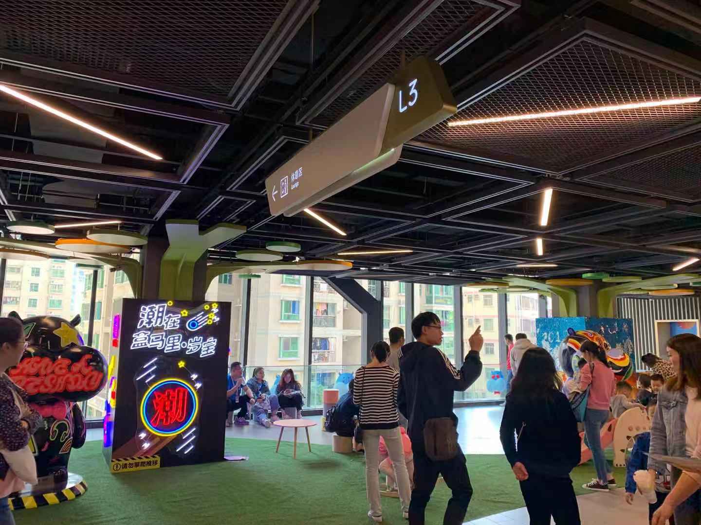 盒马里在商场中庭空间的设计上,用了不少年轻化、具有潮流感的配色及设计,使得商场显得明亮且具有现代感。