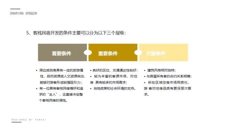 最后是次要条件,比如我们的建筑风格相对独特,与房屋所有者的合约关系明确,以及所在区域的住宿市场同质化,游客对住宿品质有更深层次需求。这个层次也是我们开发民宿需要考虑的一些因素。