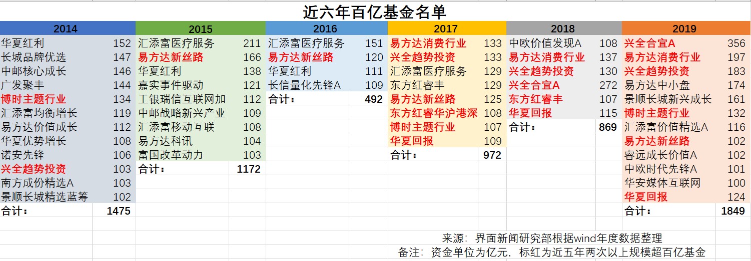上表是近六年百亿基金名单,标红色为统计期间至少两次规模超过百亿的基金。可以看到,2014年主打蓝筹风;2015年则换成一水儿的新基金;2016年量化基金走红。2017年“漂亮50”当道,也是从那一年开始,新的趋势出现了:百亿基金队伍逐渐稳定,并在今年出现了大扩容。