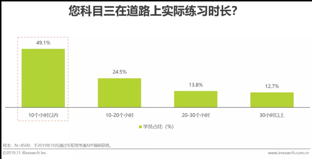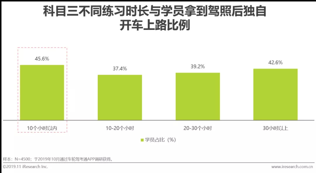 (1)不规范练习时长:七成受访学员科目三的实际练习时间小于教学大纲所规定的24个学时,而这其中有接近半数(49.1%)的学员甚至不足10小时,如此薄弱的安全意识,也间接体现在他们在拿到驾照后就独自开车上路的比例要远远大于其他练习时长更久的学员,如此以来,将给他们驾驶上路带来严重的安全隐患。