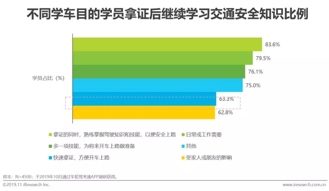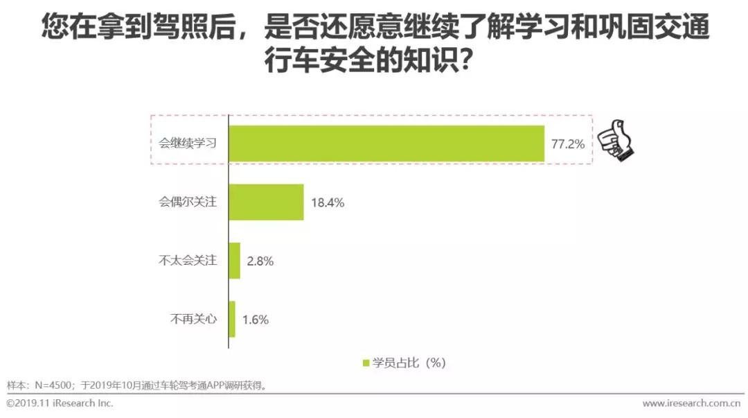 (3)拿证后的懈怠:安全意识的提升在于长期的学习和巩固,不能仅仅只局限于驾校内。从调研数据来看,77.2%的学员在拿到驾照后还是愿意继续学习和巩固交通行车安全知识的;但值得注意的是,学车目的为快速拿证上路的这一学员群体,他们的安全意识仍相对较弱,他们在学车后愿意继续学习交通安全知识的比例要低于整体水平。