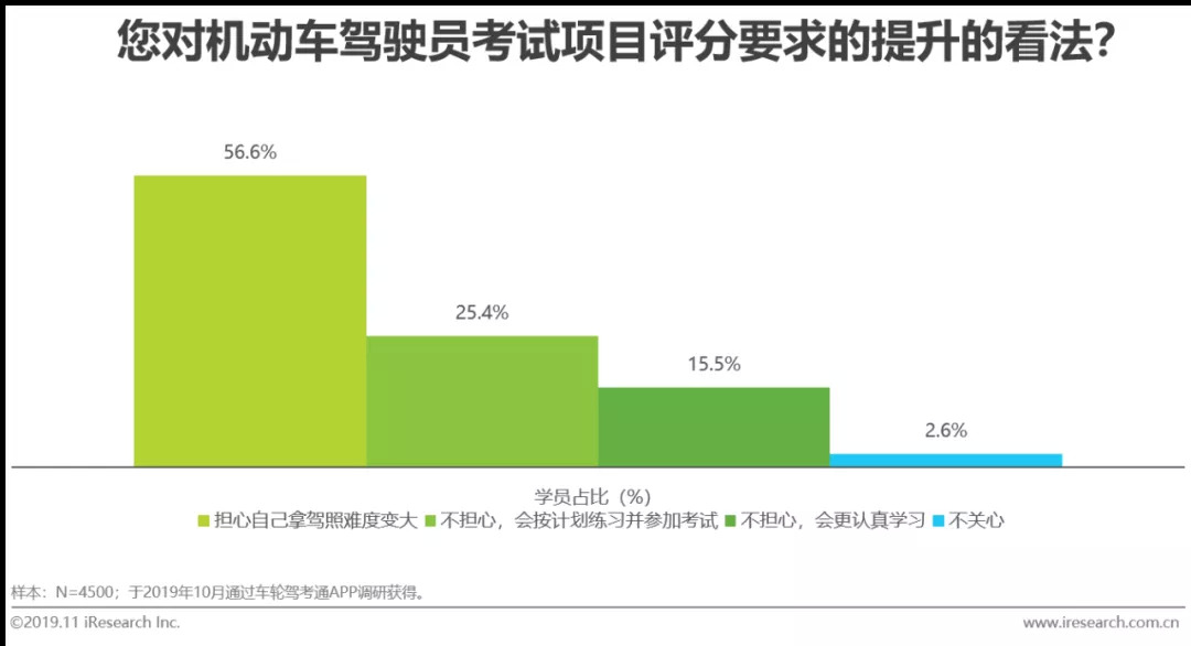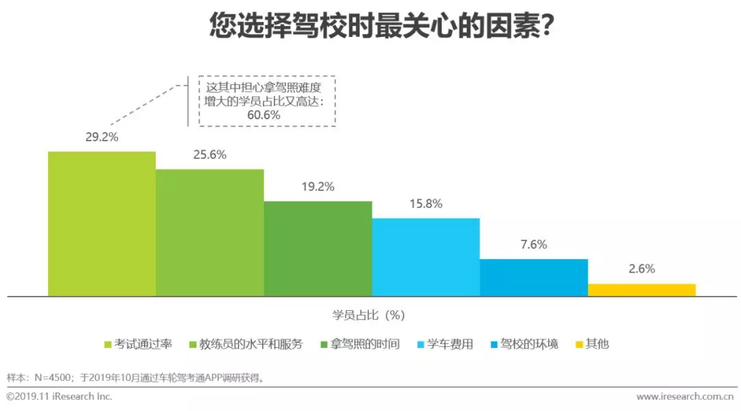(2)学车关注点偏航:2019年发布的一系列新规对机动车驾驶员考试项目的评分要求均有不同程度的提升,这本是国家为减少交通事故发生、保障驾驶员和他人的交通行车安全的重要举措,但却有56.6%的学员没有意识到这一真正用意,只担心自己拿驾照的难度会增大,并且在择校上也最关心考试通过率。学车最初的关注点的偏航,很容易为将来埋下安全隐患的种子。