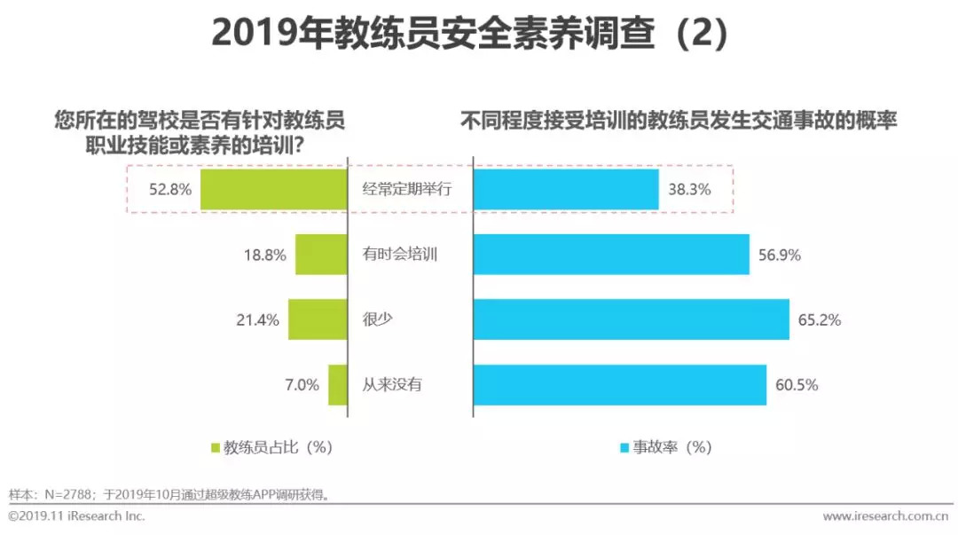 (2)定期参加安全培训:定期参与培训与同行交流是提升教练员自身素养的良好途径。53%的受访教练员表示会经常参与教练员职业技能或职业素养的培训,经常参加培训的教练员在开车过程中发生过事故的比例明显低于其他较少参加培训的教练员。