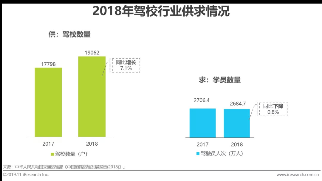 根据交通部数据显示,2018年,全国共有机动车驾驶员培训业户(驾校)19,062户,同比增长7.1%,而在2018年,全国共完成机动车驾驶员培训2684.7万人次,同比下降0.8%。我国驾校的数量已经远远超出市场需求,供大于求的关系非常明显,市场供求矛盾突出;自学直考,自主约考,异地分科目考试等新政策也对传统的驾校经营管理模式带来了冲击。市场竞争激烈,驾校更应该努力提升教学能力和服务,提高教学质量,重视学员的安全教育,树立自己的品牌,未来行业竞争的关键就在于质量,服务和品牌。