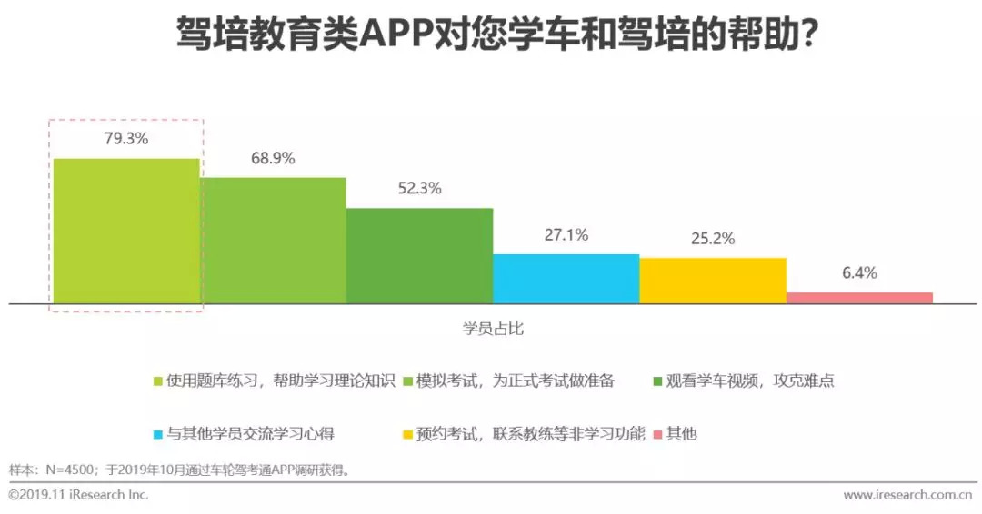 调研显示,使用驾培相关APP学习理论知识的学员占比79.3%,当然,驾培相关APP的作用不止学习理论知识,还可以进行模拟考试、预约考试等。驾培相关APP的用户多样性,促成其高频使用率,以及较高满意度,接近90%学员认可APP对他们学车和通过考试带来的帮助。例如在车轮驾考通APP上有智能答题功能并实时更新官方题库,可以帮助学员更好地学习理论知识。