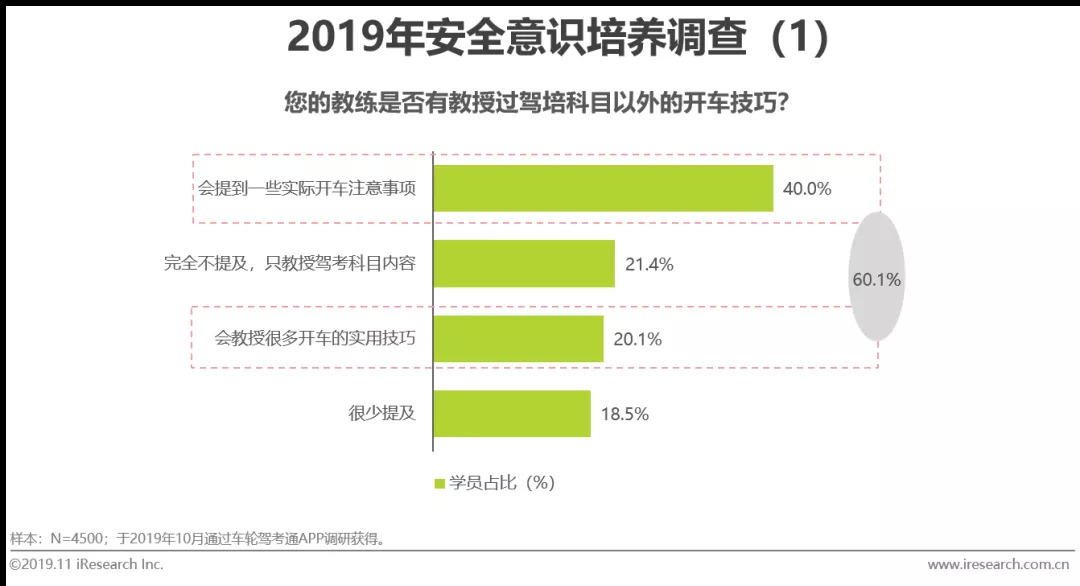 (1)驾校强化技巧:实用的开车技巧能为学员安全驾驶打下夯实的基础,60.1%的学员表示教练员会对他们教授驾培内容以外的实用开车技巧,以帮助他们培养在道路上的安全意识,及更好地安全上路。