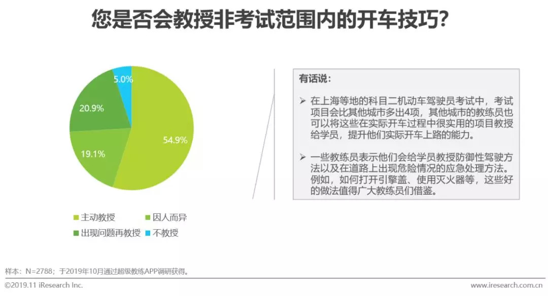 (2)道路实践课:根据对学员和驾驶员的调研,实用开车技巧对他们安全开车上路有很大帮助,他们也表示自己需要学习更多驾考范围之外的知识和行车技能。教练员也对学员们的这一需求给予了回应,有55%的受访教练员表示他们会主动教授一些驾考范围以外的实用开车技巧,值得鼓励。