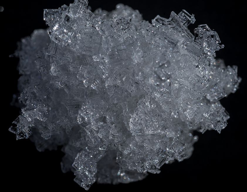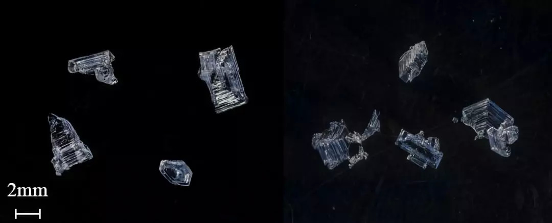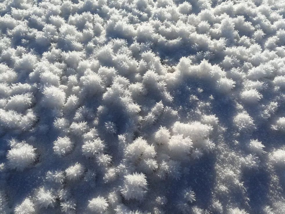 这种个体较大的雪晶体被称为深霜。深霜具有明显的菱角,相互独立,相互之间的空隙较大。深霜相互之间的结合差,空隙较大,其呈现散碎形态,我们也称其为糖雪,犹如白糖一样零散。这就是为什么有时候走在雪地上,会一脚踩空的原因。