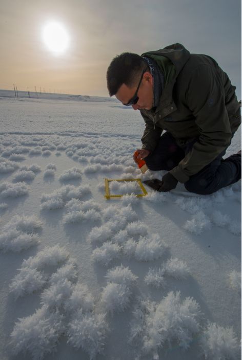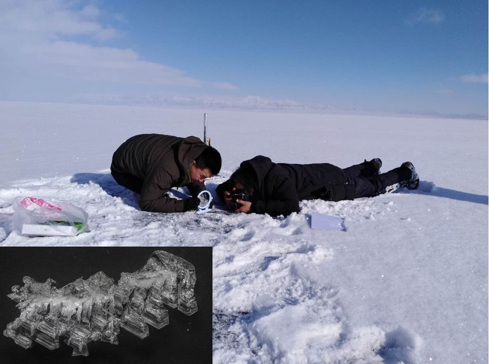 中国科学院新疆生态与地理研究所积雪研究团队对赛里木湖湖面雪晶体样本拍照(摄影: 范书财 2019年1月17日)