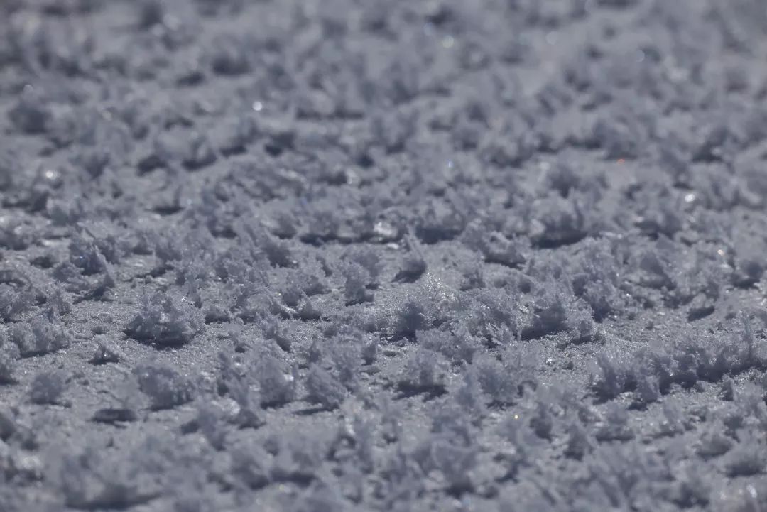 深霜发育的同一时期,位于表层的雪晶体也呈现生长态势。它接触大气中的水蒸气,当水蒸气达到冰点时,会导致从水蒸气(气体)到冰(固体)的相态变化并粘附在雪晶体上。当相对湿度高于90%且温度低于 8°C时,就会形成蕨类状的冰结构,我们称为表霜。