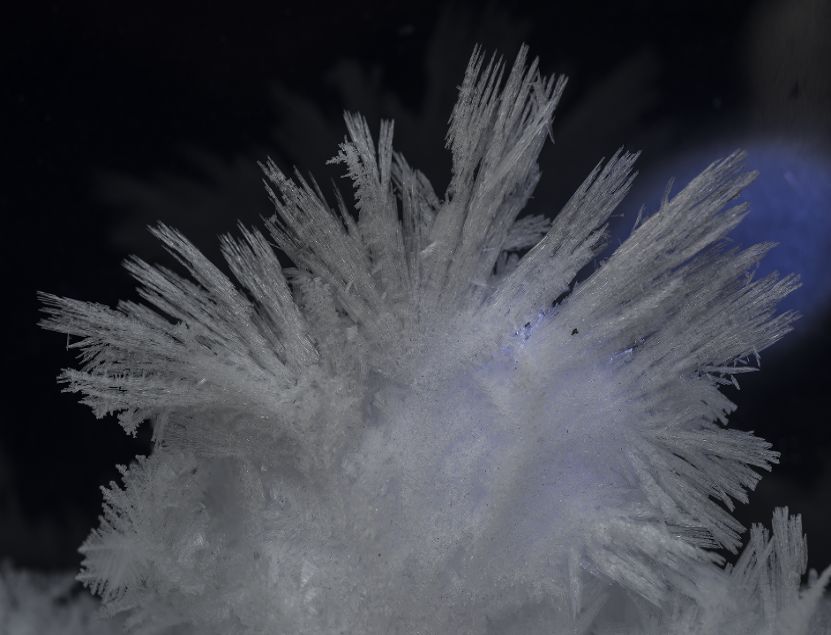 表霜一般逆着风向生长,因为迎风来的空气比背风来的空气湿度更高。但风不能太强,否则会损坏脆弱的蕨类状冰结构。