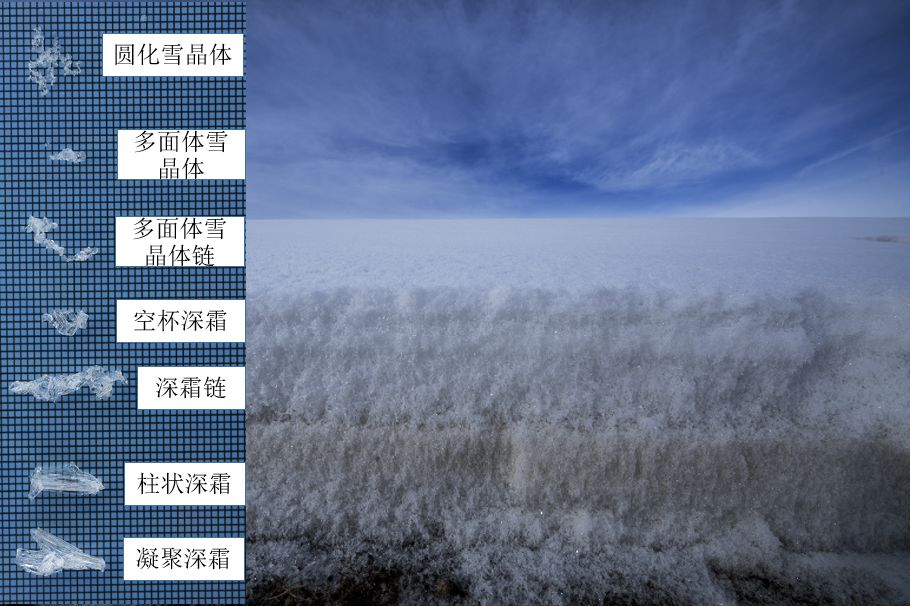 一个理想化的自然雪晶体从初始到深霜的发育变质过程为:新雪沉降-雪晶体破碎和圆化-多面体雪晶体-深霜。理论上,雪剖面观测到的雪晶体从上到下为圆化雪晶体,多面雪晶体,深霜。