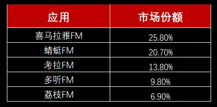 靠着这轮对资源的囤积,行业迅速完成了整合。根据易观国际统计的数据显示,2015年上半年,喜马拉雅、蜻蜓FM、考拉FM、多听FM的市场份额分别为25.8%、20.7%、13.8%和9.8%。各平台瓜分版权内容之后,竖起了独家的内容壁垒,这场版权争夺战也引导行业完成了第一轮洗牌。