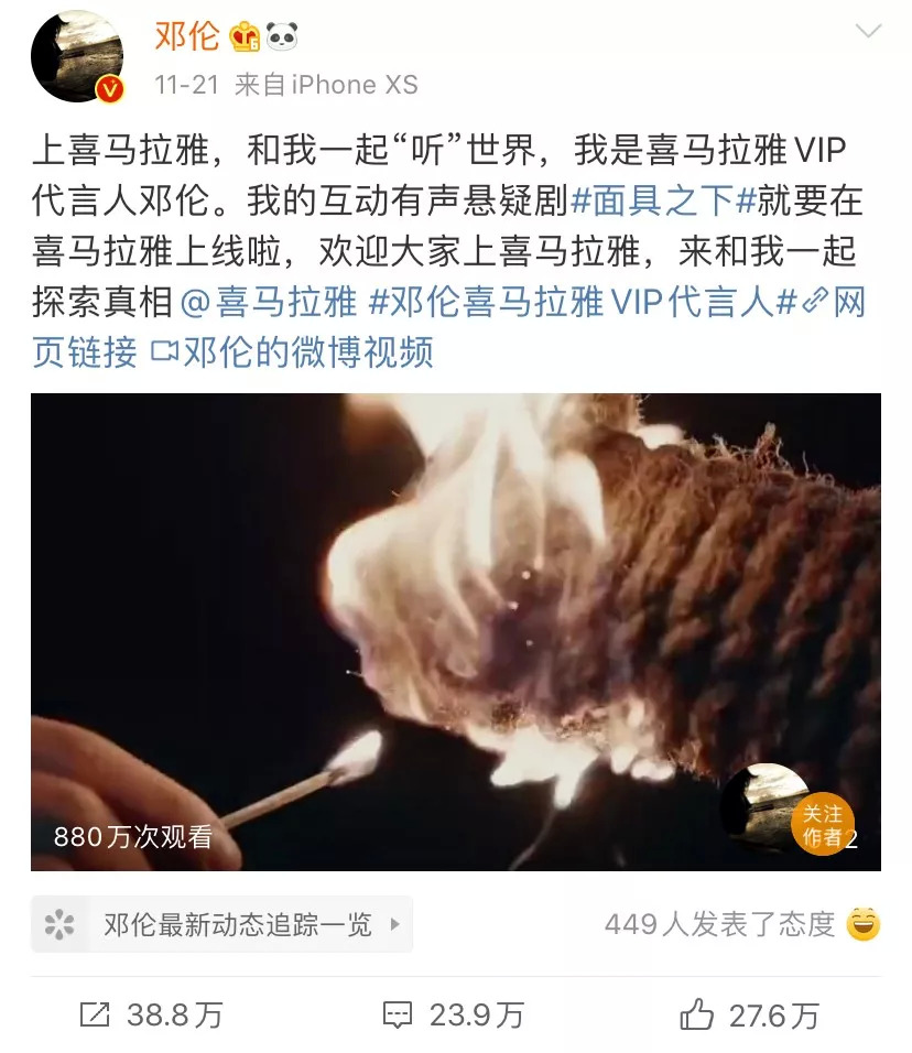 11月21号,邓伦发布微博宣布自己的首部互动有声悬疑剧《面具之下》在喜马拉雅上线。听闻消息,热情的粉丝们第一时间便冲到音频平台上留言,在《面具之下》第一集1.2万的留言评论当中,不乏很多为偶像打call时的声音。截至毒眸发稿日,《面具之下》已经位列喜马拉雅的人文新品榜的第一名了。