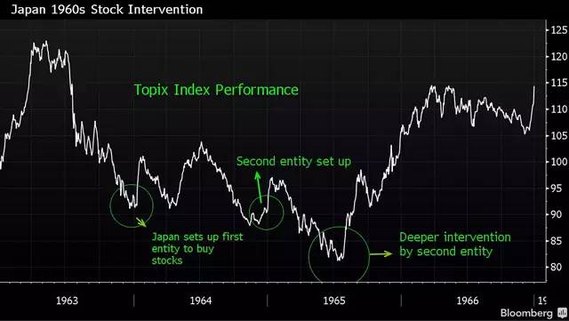 在1963年日本股市遭遇大规模抛售之后,日本当局开始介入市场进行干预。据日本央行文件显示,在1964年和1965年,日本成立了两个救市基金。第一个救市基金是由商业银行注资,购买股票的资金规模达到1936亿日元;在第一个救市基金的资金消耗完之后,日本央行开始给予支持。第二个救市基金又购买了2349亿日元的股票,其中95%的资金由日本央行承担。