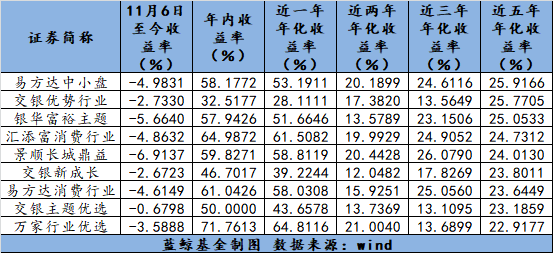 以主动权益类基金中近五年年化收益率最高的易方达中小盘为例。Wind数据显示,截至11月29日,该基金近五年、近三年、近两年、近一年的年化收益率分别为26%、25%、20%、53%,可以说业绩非常稳定;且该基金近五年一直保持着高仓位运作,即使在2015年、2018年的熊市中也没有大幅减仓,说明该基金淡化择时,且回撤控制的非常好,虽然近期(11月6日~11月29日)有4.98%的回撤,但不妨对基金经理多些信心。