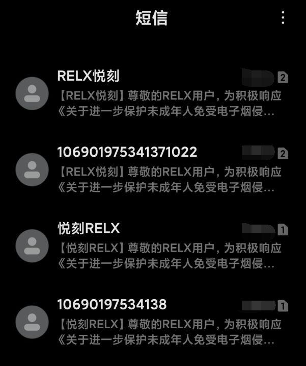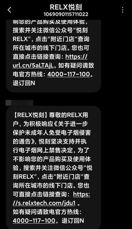 这位朋友表示,他购买过的悦刻电子烟,在一天时间内接连发来四条短信!而短信内容惊人一致——悦刻响应政策号召决定不再于网上销售,而是在线下渠道持续发力,并给出线下门店的查询方式。