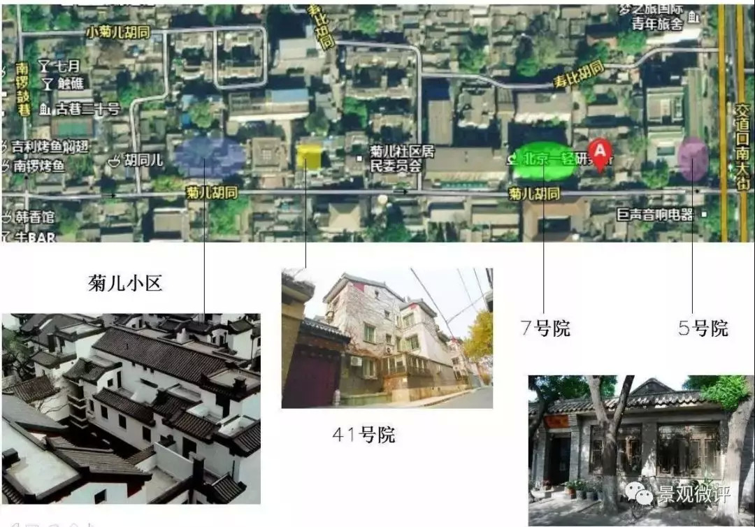 在菊儿胡同的改造中,菊儿小区的例子最为典型——菊儿小区在菊儿胡同北侧,17号至49号几处院落。从外面看去,二至三层的小楼,青瓦白墙,看上去有些徽派建筑风格,恍如到了江南。但那青色小瓦砌成的房脊屋檐,又与两旁的老房子连成了一体,恰到好处地勾勒出北京胡同的“天际线”,以至于从远处眺望时,丝毫觉察不出这片建筑比周边明显高出一截。