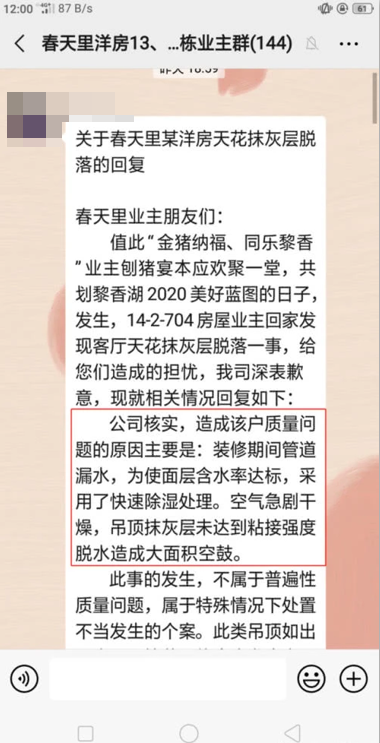 12月1日事情发生后,中海黎香湖春天里在业主群里就此事做了“关于春天里某洋房天花抹灰层脱落的回复”。