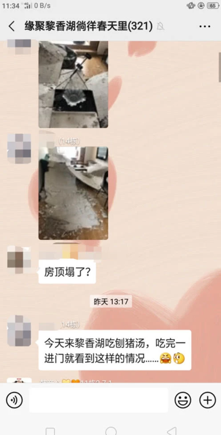 “今天来黎香湖吃刨猪汤,吃完进门就看到这样的情况……”中海黎香湖14栋2单元704业主在“缘聚黎香湖徜详春天里”业主群里写道,群里配的图片显示,该业主家客厅天花板大面积垮塌,沙发、茶几被砸中。所幸事故发生当时,业主并不在房子里。
