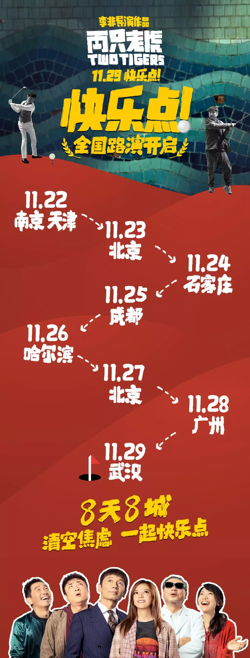 针对三四线城市下沉市场,《两只老虎》主创在11月22日,开启了包括武汉、石家庄、成都等城市的,8天8城的全国路演活动。