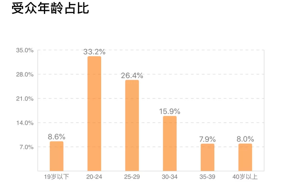 受众年龄方面,20-24岁依旧为主力群体达到33.2%,25-29岁群体位列第二26.4%。片方想要破圈的19岁以下全体只有8.6%,不及30-34岁群体的15.9%,未有亮点。
