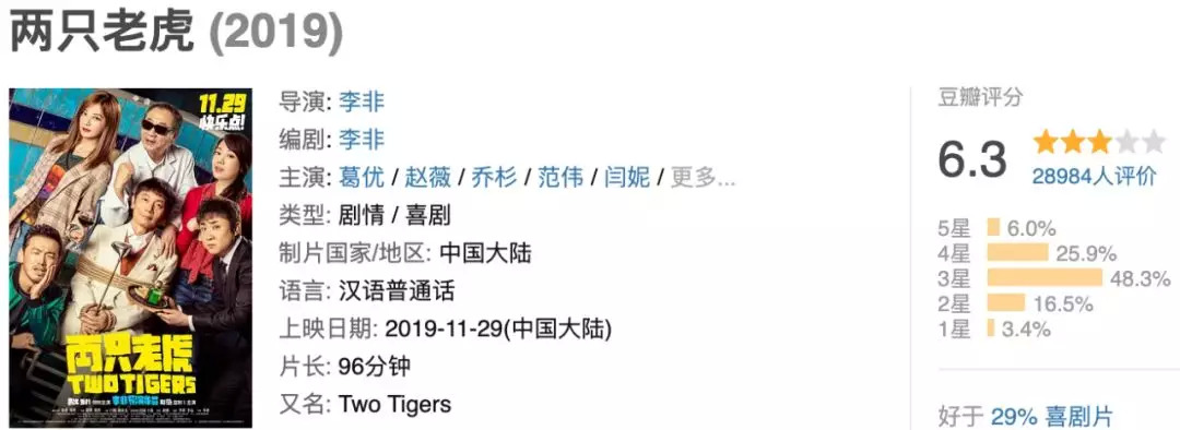 这不禁令观众诧异,顶配明星坐镇,宣发方精准营销的国产喜剧电影只配拥有2.5亿元票房?“爆款像”十足的《两只老虎》为什么票房扑了?