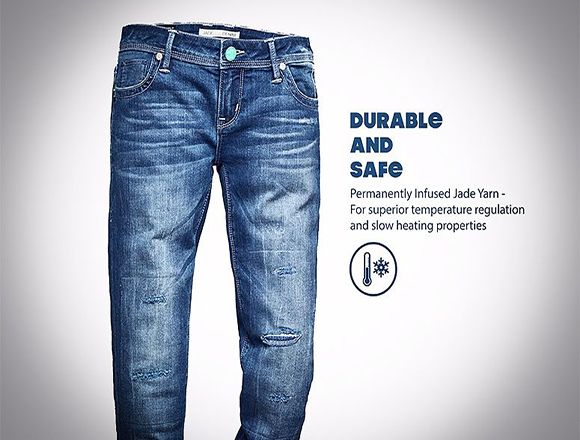 今年4月份,隶属于美国威富集团(VF Corp.)的牛仔裤品牌Lee,就推出了号称能帮穿着者降温的牛仔裤,取名“精玉透凉牛仔系列(Jade Fusion Line)”。顾名思义,这款牛仔裤在制作过程中真的加入了玉石的颗粒,为了避免硌得慌,Jade Fusion还特别加入了21.9%的莱卡弹力丹宁,以加强布料的弹性,确保活动自如。