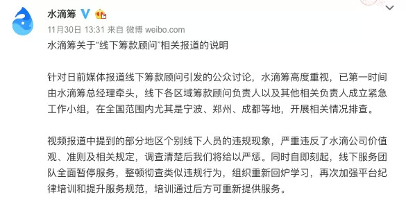 今日下午五点十五分,水滴筹微博发布声明,“线下人员违反服务规范的类似现象确有不同程度存在,公司管理层认为,这类问题核心是公司的管理问题,水滴公司管理层自身必须对此负责,承担相应管理责任。同时,水滴筹将调整绩效模式。”