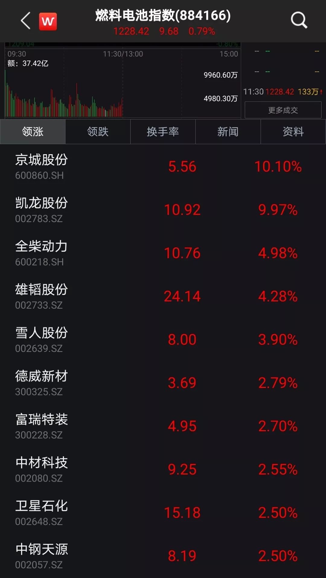 消息一出,燃料电池板块个股开启群涨模式。wind数据显示,截至12月3日午盘,燃料电池指数上涨0.79%。京城股份、凯龙股份涨停,全柴动力、雄韬股份、雪人股份等个股上涨3%以上。