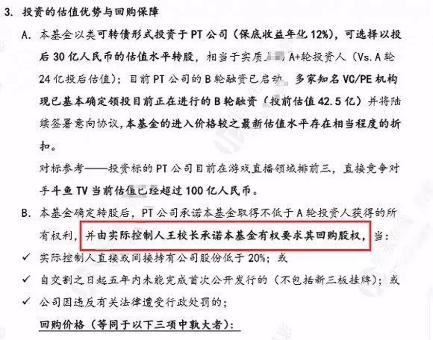 投资方之一的钜大秀赢财股权投资基金的核心条款显示:“本基金确定转股后,PT公司(编者注:PT是特别转让的英文缩写)承诺本基金取得不低于A轮投资人获得的所有权利,并由实际控制人王校长承诺本基金有权要求其回购股权。”