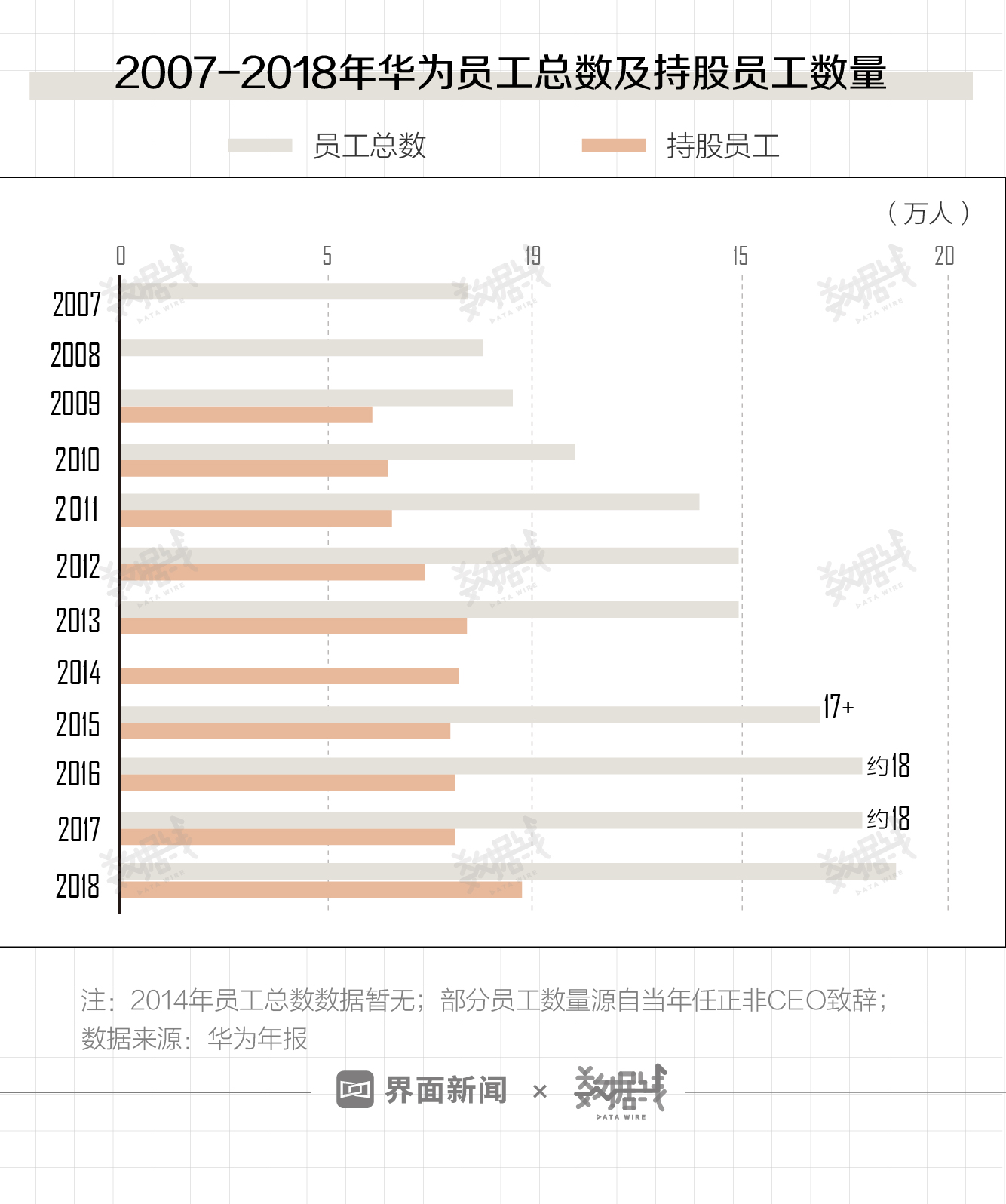 据界面数据(公众号ID:shujuxian_kuaikan)统计其公司年报,2007年至2018年,华为员工人数由8.4万人增长至18.8万人,十二年间增加了10.4万人。截至2018年12月31日,华为持股员工数量达到9.7万人,比2009年多出3.6万人。