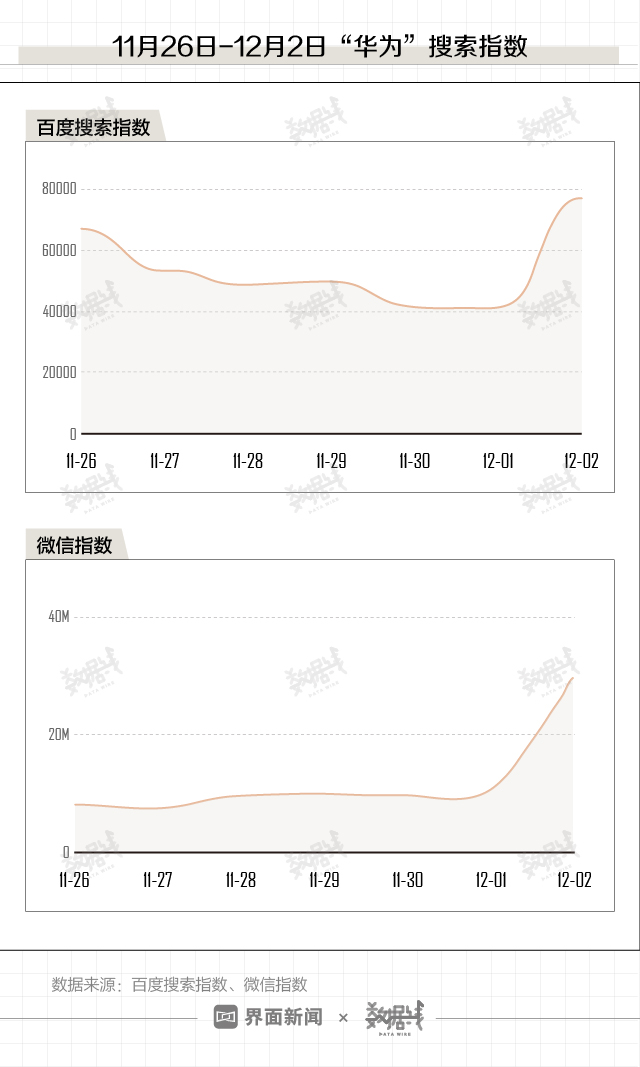 微信指数平台显示,2019年12月2日,“华为”微信指数近3000万,日环比175.25%。