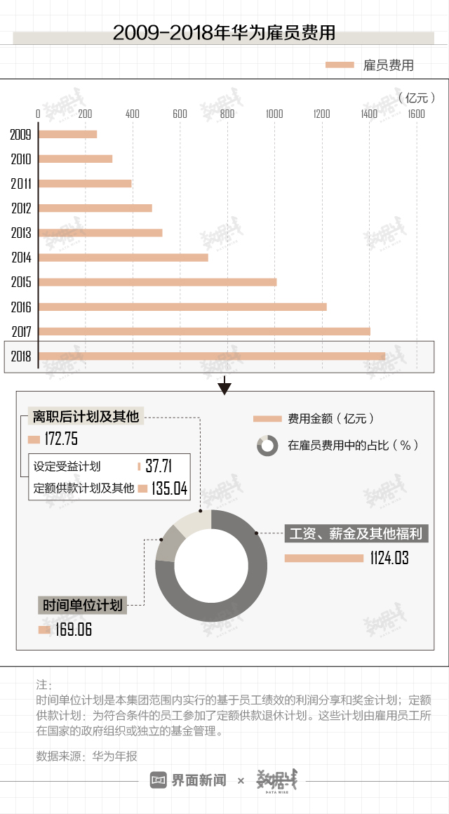 与此同时,十年间,华为的雇员费用(包含工资、薪金及其他福利、时间单位计划及离职后计划及其他)由248.16亿元增长至1465.84亿元。