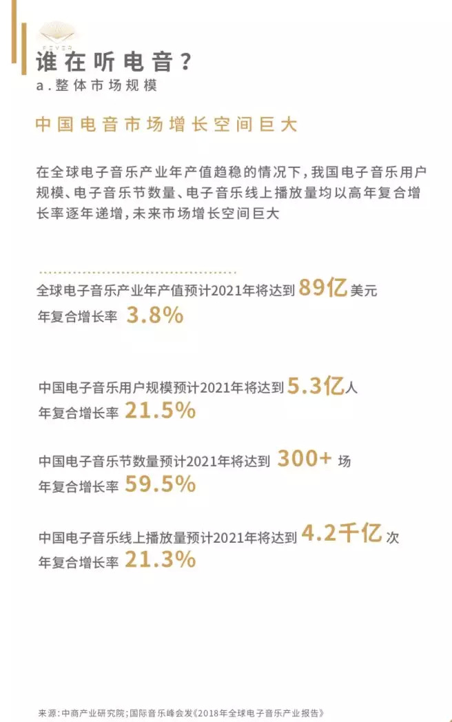 首先,市场其实一直都在,且正不断对外释放其有强烈需求的信号。据由你音乐榜的2019两个季度报告显示,电音内容的市场欢迎度始终处在除流行品类之外的前两位;据《2019中国电音市场洞察报告》显示,2021年中国电子音乐用户规模将达5.3亿人,中国电子音乐线上播放量预计达到4.2千亿次。