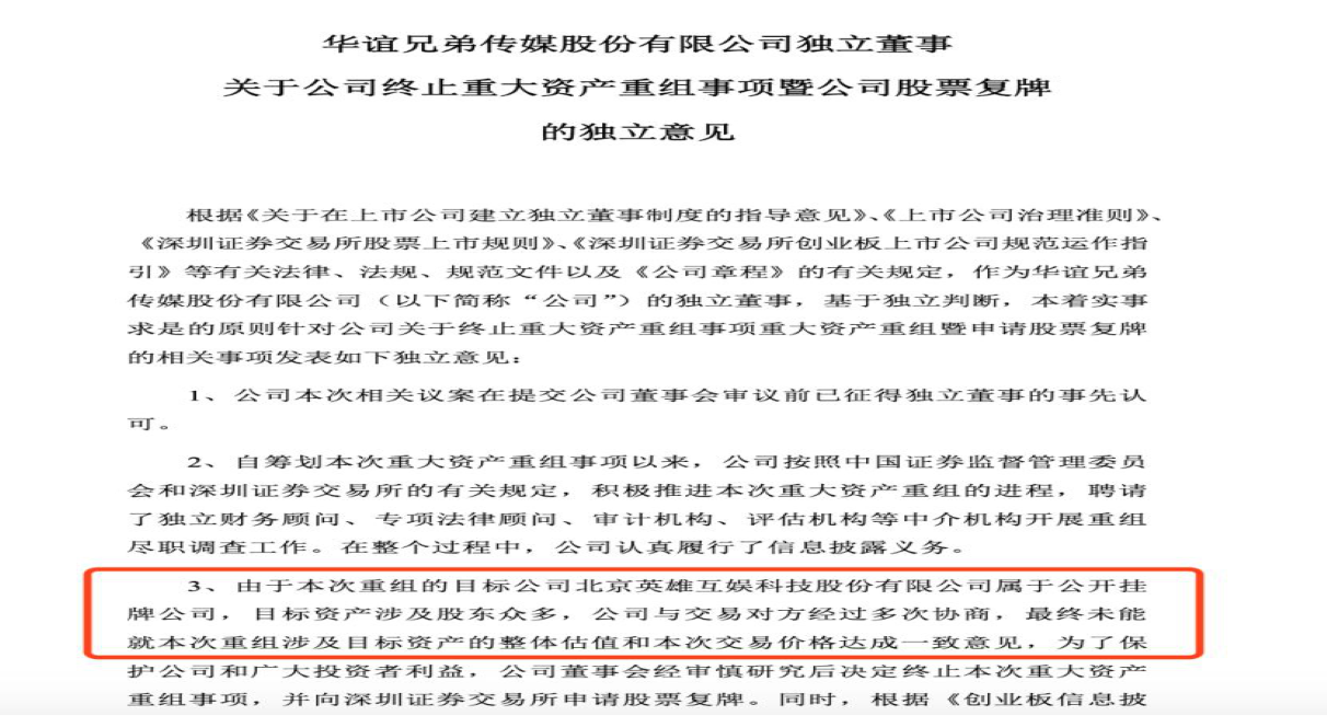 至于终止重组的原因,华谊兄弟方面的说法是,由于英雄互娱涉及股东众多,公司与交易对方经过多次协商,最终未能就本次重组涉及目标资产的整体估值和本次交易价格达成一致意见。