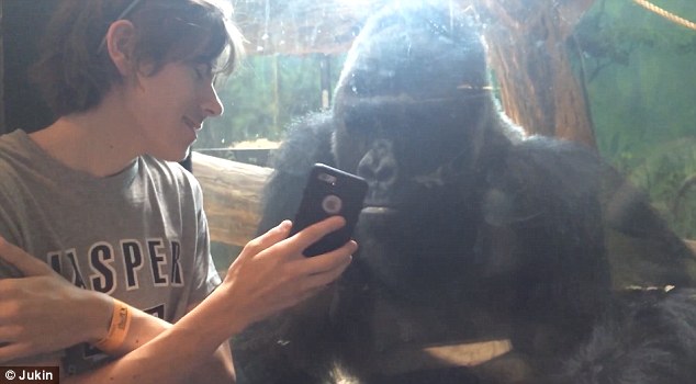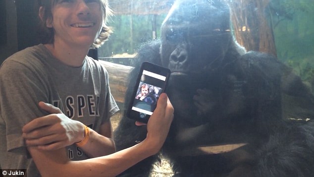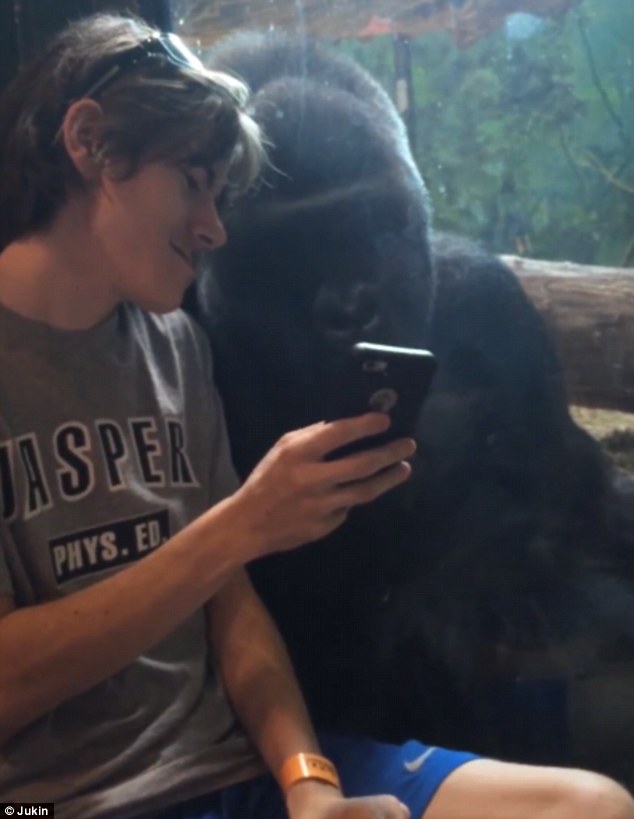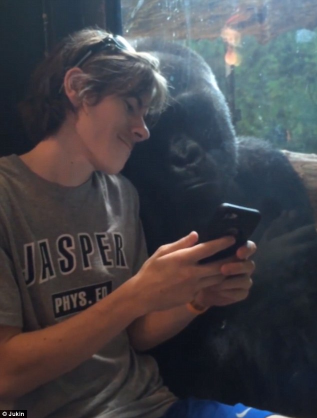 要不是事先知道透明玻璃墙的存在,乍看这一幕,你会觉得这就是大猩猩靠在小伙子的肩上,小伙为了能让大猩猩看清楚手机上的内容,还将手机专门侧向它。