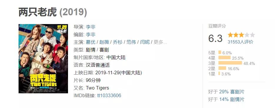 其实说实话,之前对《两只老虎》的期待值还是蛮高的,毕竟有葛优、范伟两大实力派影帝,还有金像奖影后赵薇加持,再加上乔杉、潘斌龙、闫妮等一众喜剧熟脸加盟,颇有喜剧黑马的潜质。
