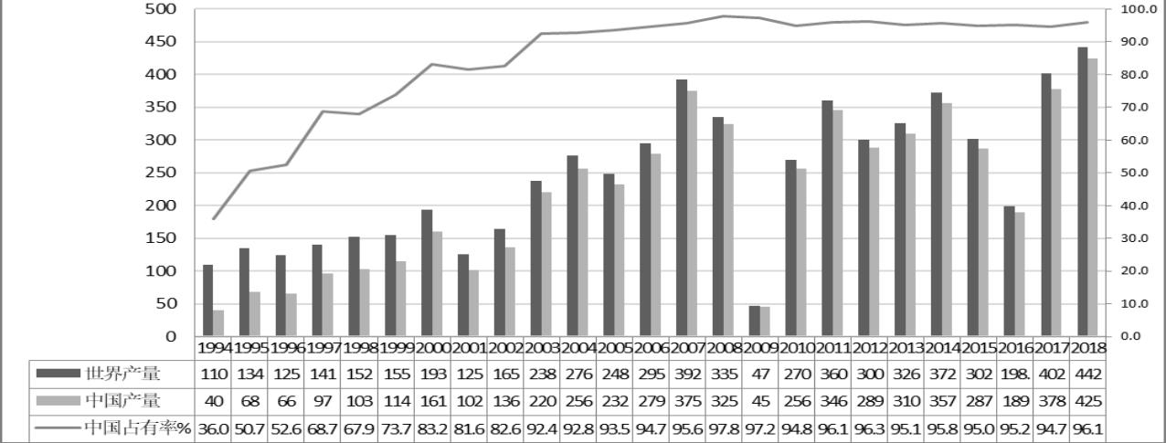 2018年,集装箱生产进入高位运行周期,中国全年产量约425万TEU,较上年约增长12%,创集装箱生产规模历史最高水平,在全球市场占有率达到近96.1%。